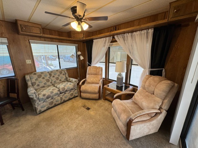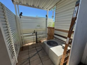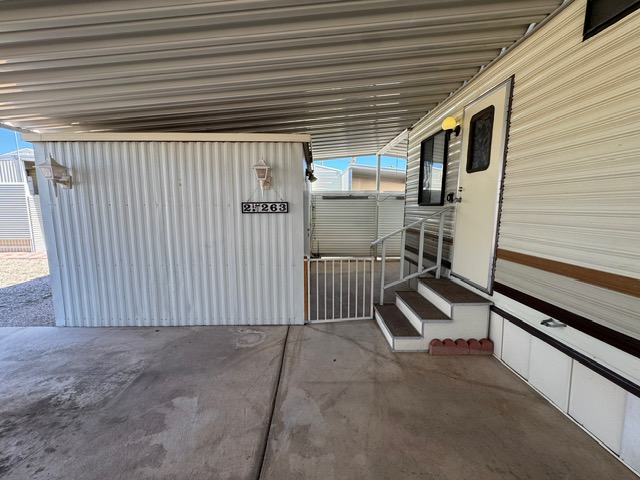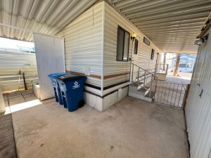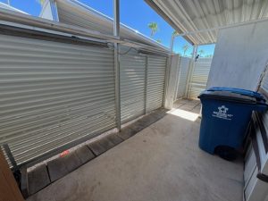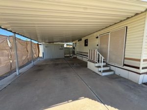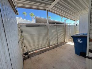 The spacious shed has a finished interior, has electricity and plumbing, and includes a stack washer & dryer. The rear yard has a covered patio with privacy louvers on the side and rear walls to create a private outdoor space. The home has new carport support posts and a privacy solar screens as well as on the sliding glass door. This home includes living room, dining room and bedroom furnishings to make this home turn-key ready. This home is priced well below comparable homes. It is priced to sell quickly—giving buyers the flexibility to make updates to their own taste. This home has no sales tax.