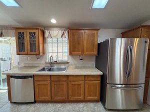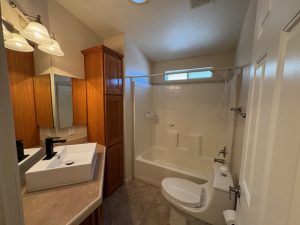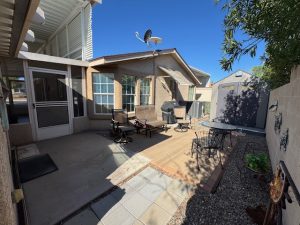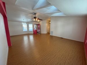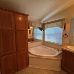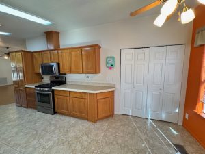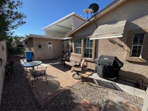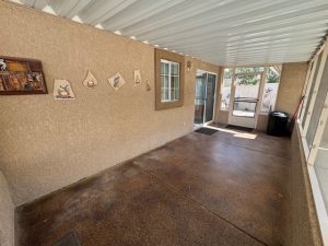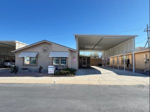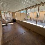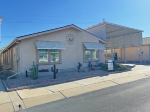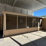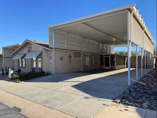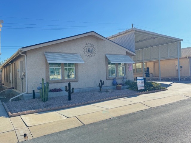 Welcome to The Bay at the Voyager Resort, an age qualified 55+ active and vibrant community, where you can find yourself in your dream home. Here is a beautiful 2006 Cavco New Haven home with 1,456 sq. ft with beautifully designed living space. This home features an open floor plan with two bedrooms, den, two baths, a large Galley Kitchen, inside laundry, screened in patio, mature landscaping, and a relaxing private rear yard. This home offers the perfect blend of modern amenities and timeless charm. This is a rare opportunity to own a home that has an attached RV Port with full hook-ups. It is a substantial structure to protect your RV “home away from home” investment”. It will fit a 42′ RV and still have patio space at the rear of the RV.