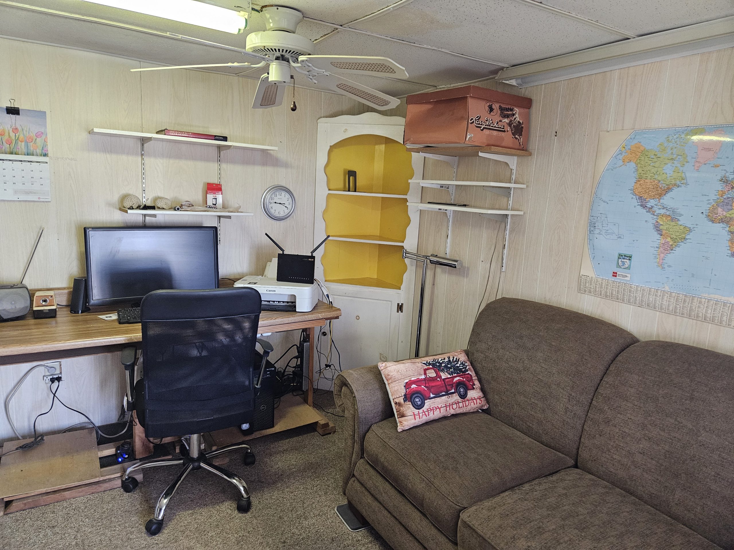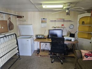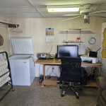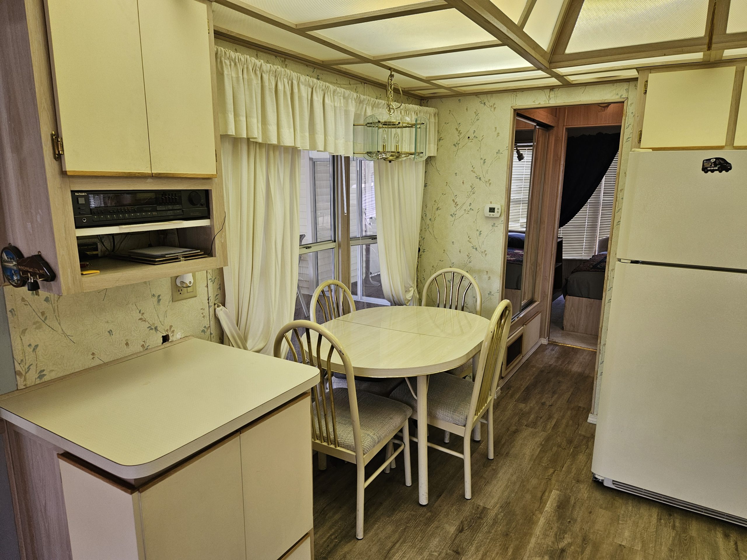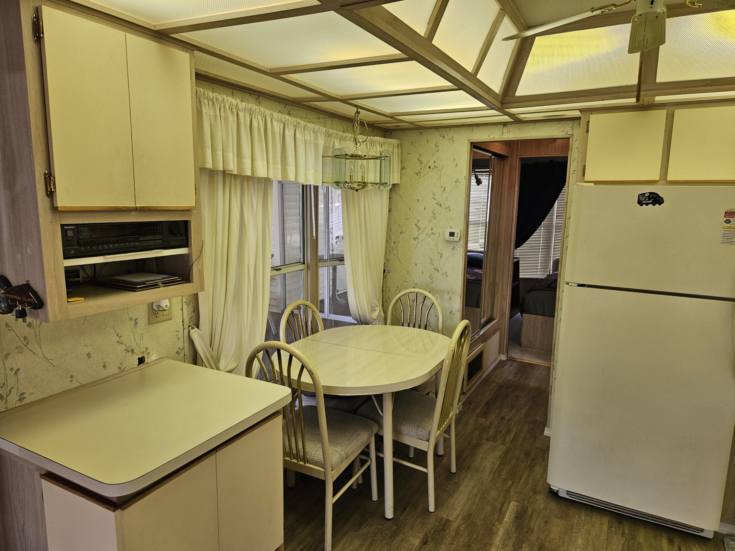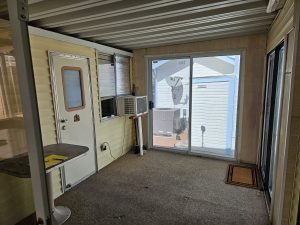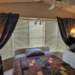 Welcome to the Voyager Resort, an age qualified 55+ active and vibrant community, where you can find yourself in your dream home. This 1989 Woodland Park, Park Model home features a bright, spacious, open floor plan home. There’s numerous Bay Windows in the Living Room, Dining Area, and Bedroom creating a light filled interior.  Beautiful Wood Laminate floors run throughout the home except for the Living room and Bedroom which features lush carpeting. The kitchen has “drop” ceiling lighting, creating a bright workspace. The kitchen even has a built-in Dishwasher!  The large bath features a tub/shower combination and a skylight. The inviting bedroom is large in park model standards and features a sliding glass door to the deck. For outdoor enjoyment, the deck is quite large for entertaining large parties. There is a deck level shed with a finished interior and a window AC / Heat unit. The space could be a home office or a guest suite.  The powerful Central HVAC Heat Pump system is about 4 years old. This home comes fully furnished and is turn-key ready. The Golf Cart is included with the home.