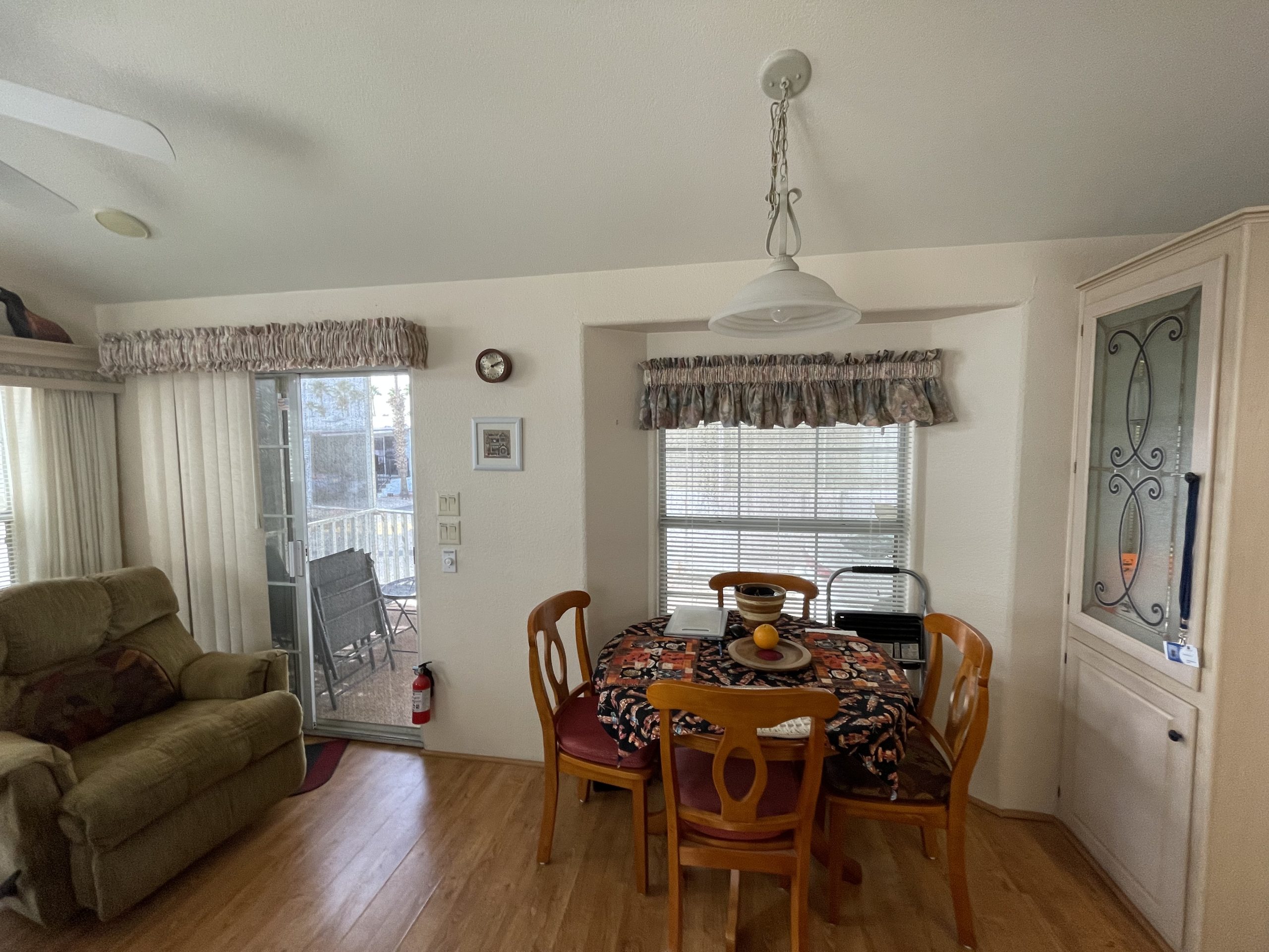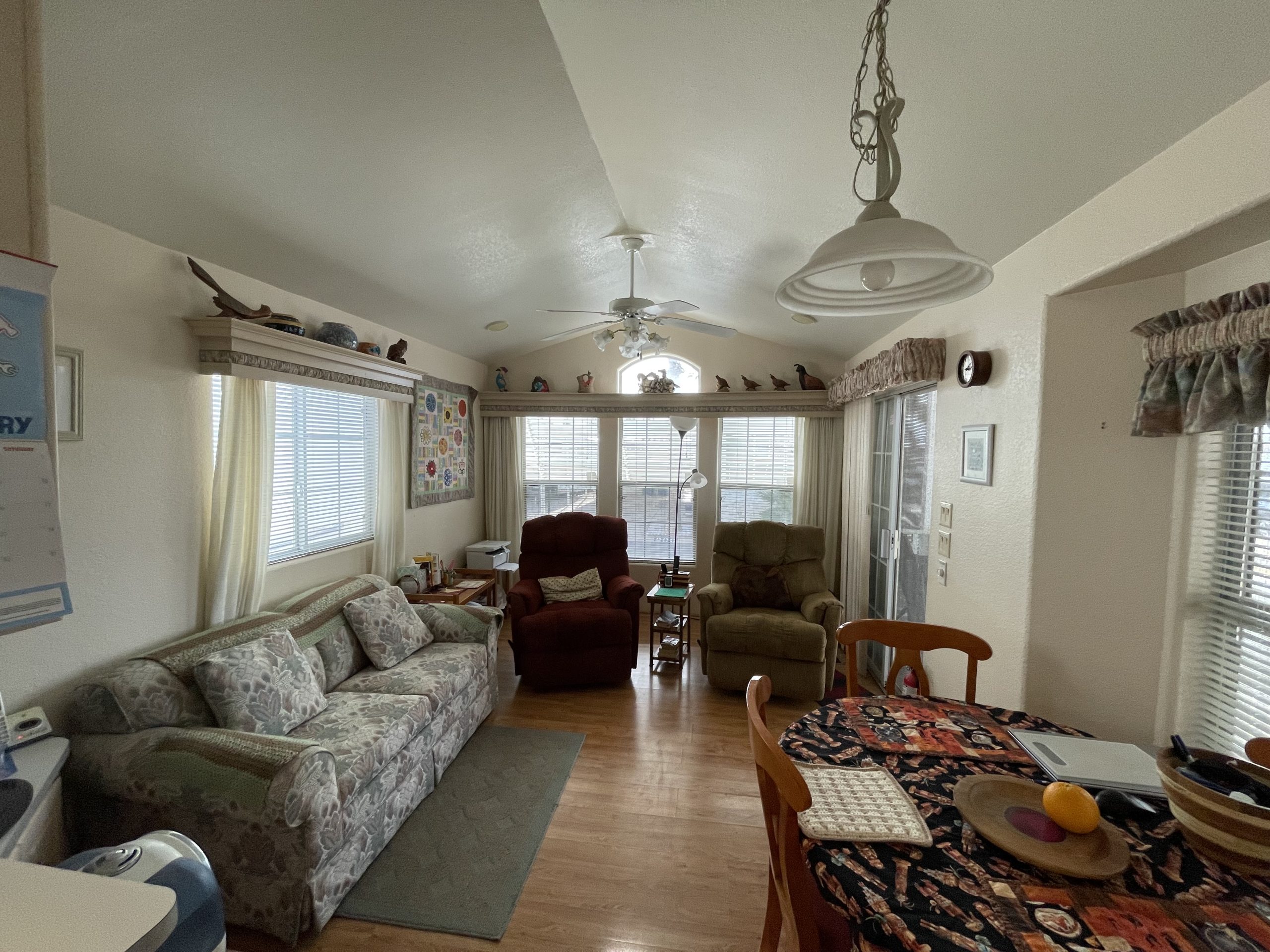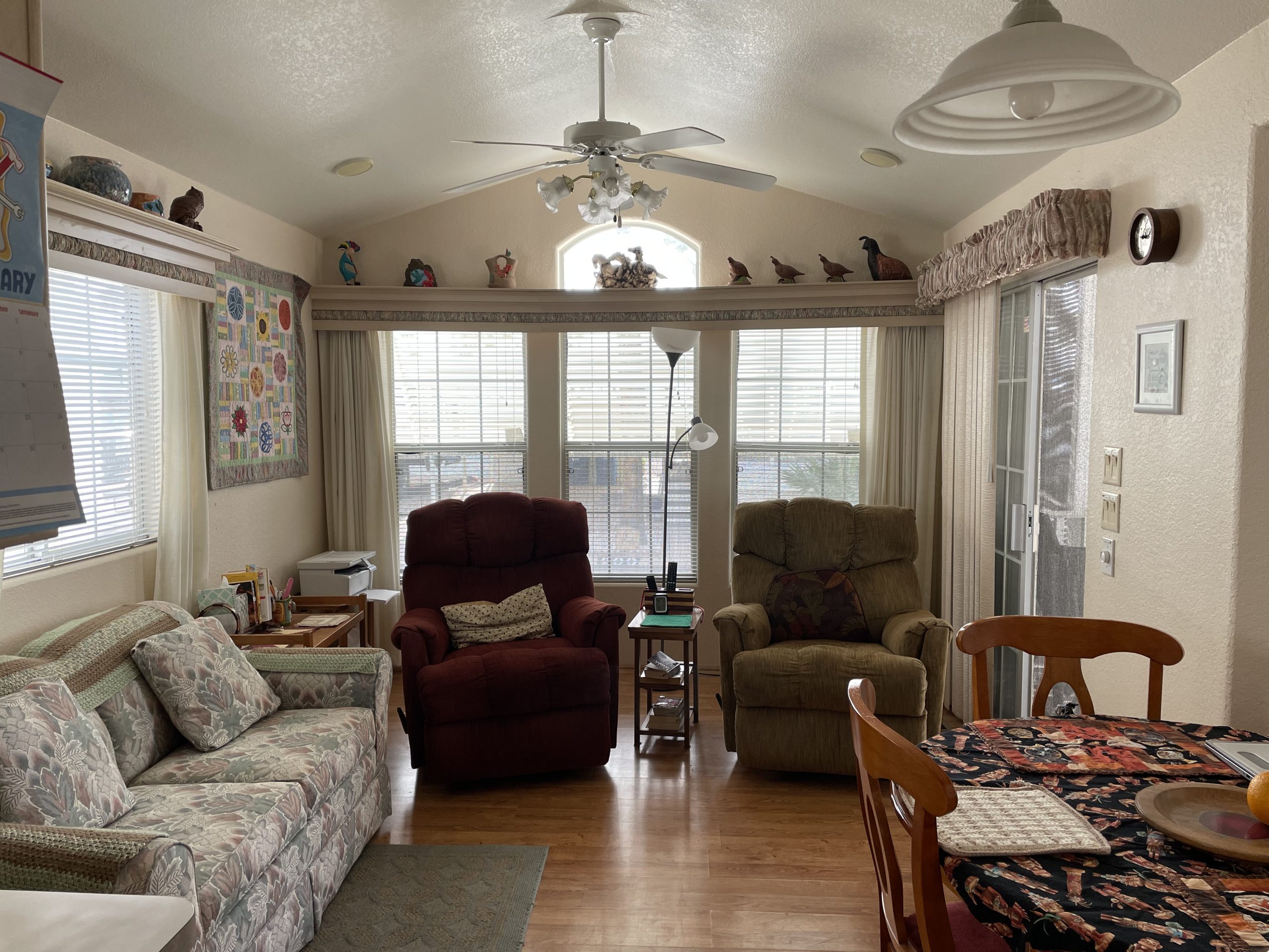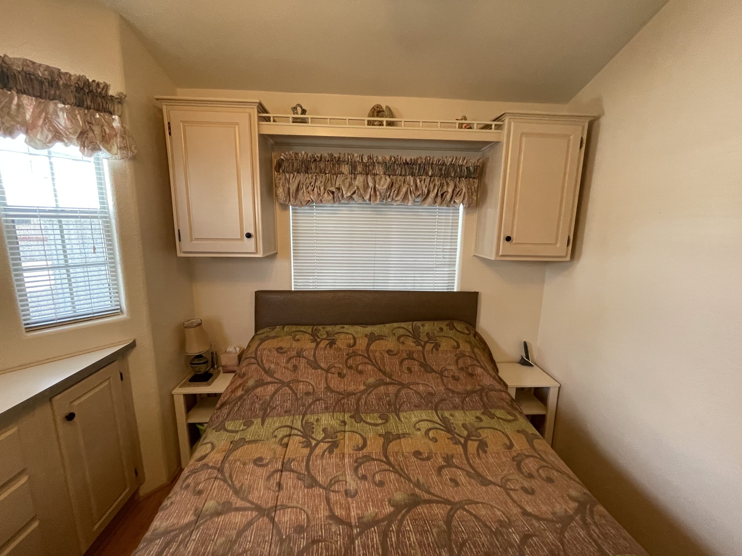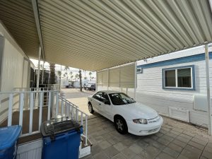 The interior of the home is light and bright. Cabinets and window valances are in a whitewash finish. Large dual pane windows and a living room clerestory window fill the space with natural light. Flooring throughout the home is a beautiful wood laminate floor. The large bathroom features a tub / shower combination and has a skylight. The bedroom has a huge, mirrored closet and built in cabinets and drawers. This home is also equipped with a high-speed 5G internet service. This home comes nicely furnished and is turn-key ready. Unique to this property is a full awning over the home and carport. This protects the roof from the elements and keeps the home cooler in the summer months. The height of the canopy will allow for high profile vehicle parking. The deep driveway will fit 2 vehicles with tandem parking. The large storage shed includes a stackable washer & dryer. This home is ideally located on a quiet street, yet a short walk to all the activities and amenities.