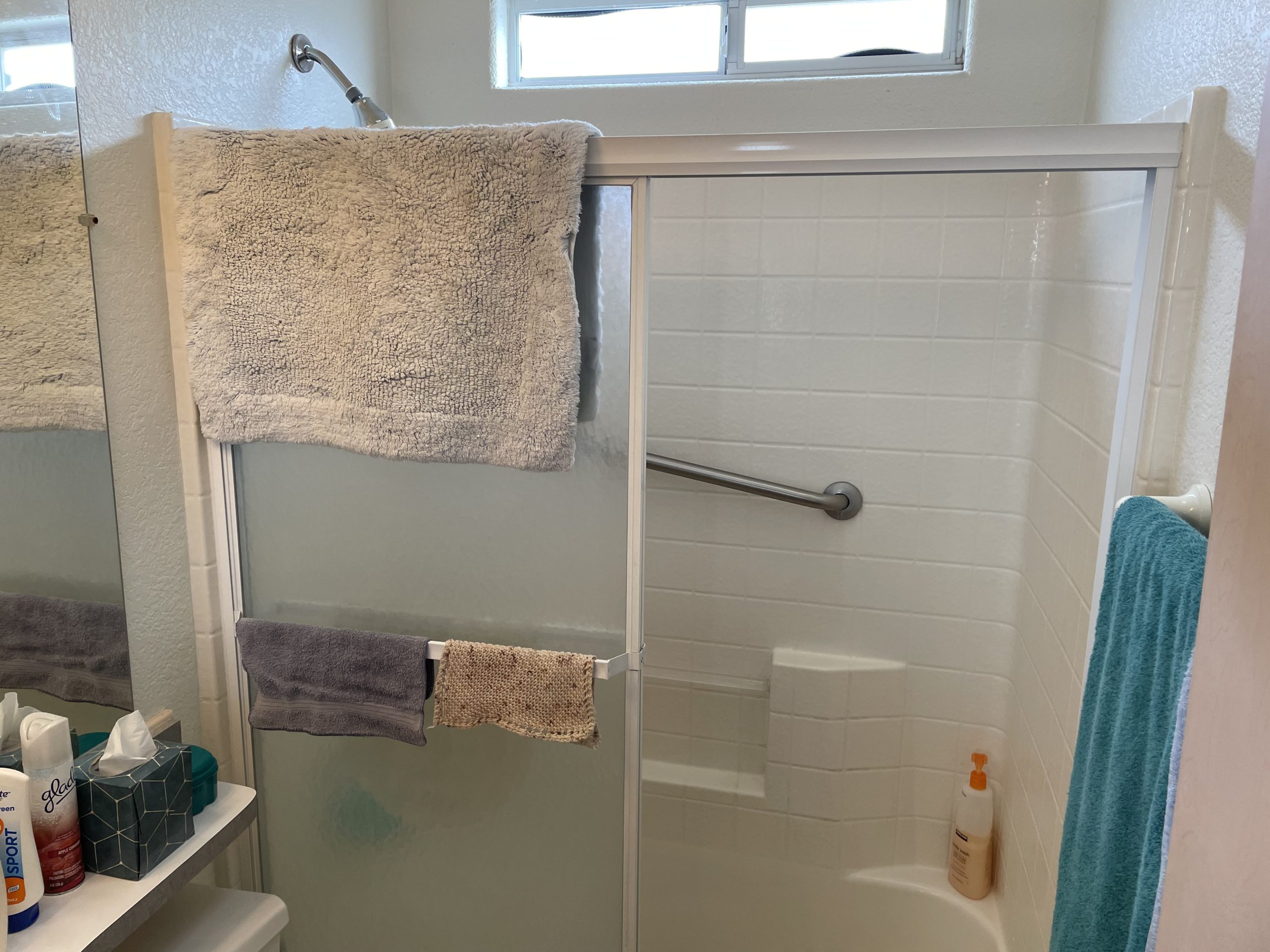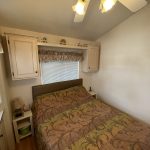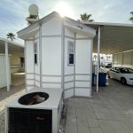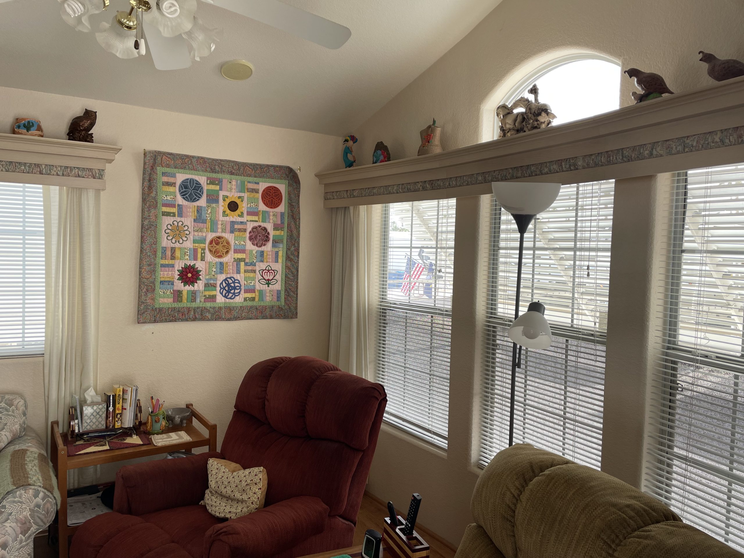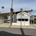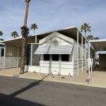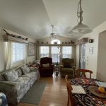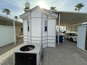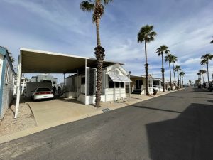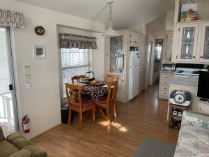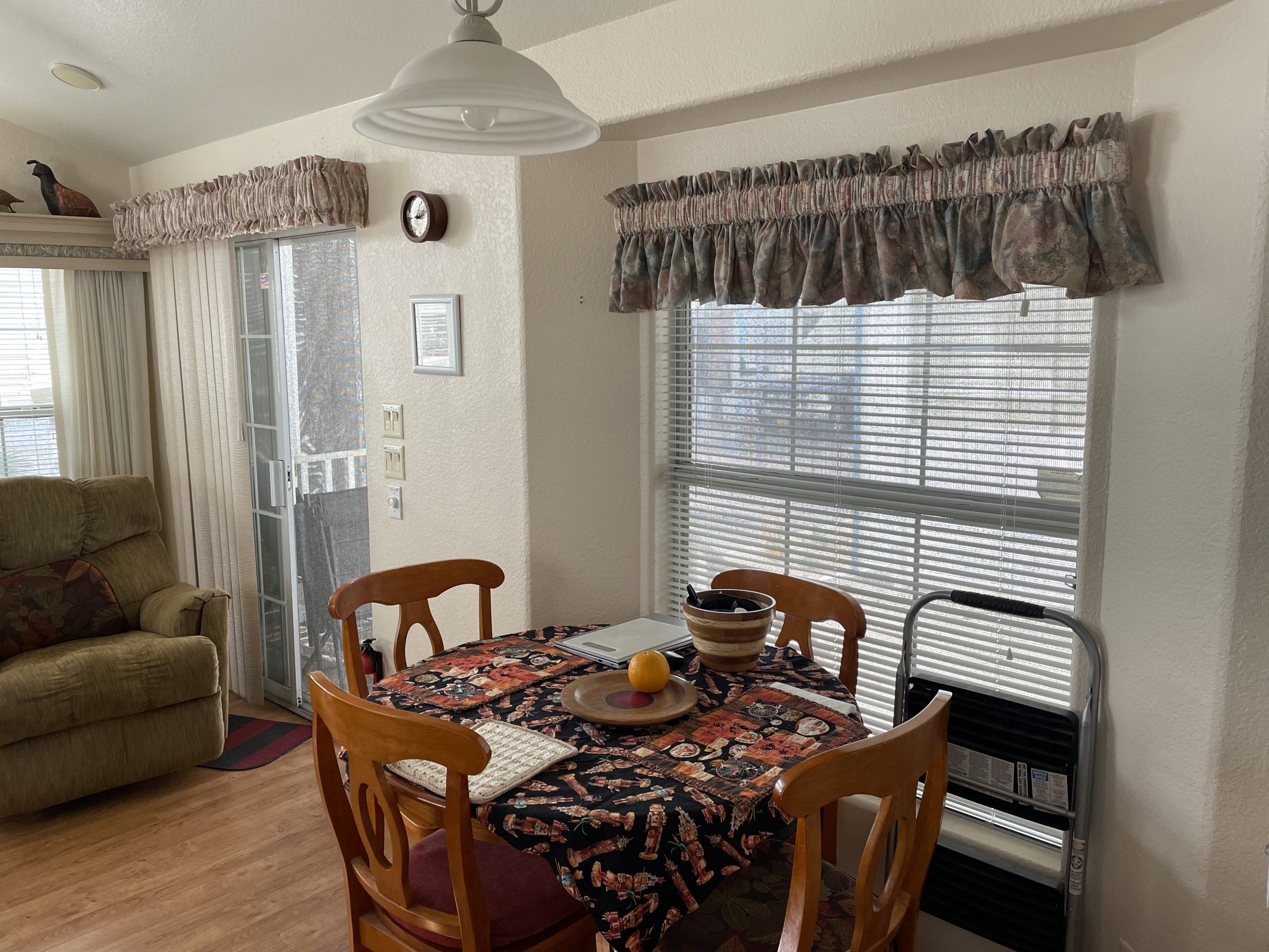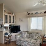 The interior of the home is light and bright. Cabinets and window valances are in a whitewash finish. Large dual pane windows and a living room clerestory window fill the space with natural light. Flooring throughout the home is a beautiful wood laminate floor. The large bathroom features a tub / shower combination and has a skylight. The bedroom has a huge, mirrored closet and built in cabinets and drawers. This home is also equipped with a high-speed 5G internet service. This home comes nicely furnished and is turn-key ready. Unique to this property is a full awning over the home and carport. This protects the roof from the elements and keeps the home cooler in the summer months. The height of the canopy will allow for high profile vehicle parking. The deep driveway will fit 2 vehicles with tandem parking. The large storage shed includes a stackable washer & dryer. This home is ideally located on a quiet street, yet a short walk to all the activities and amenities.